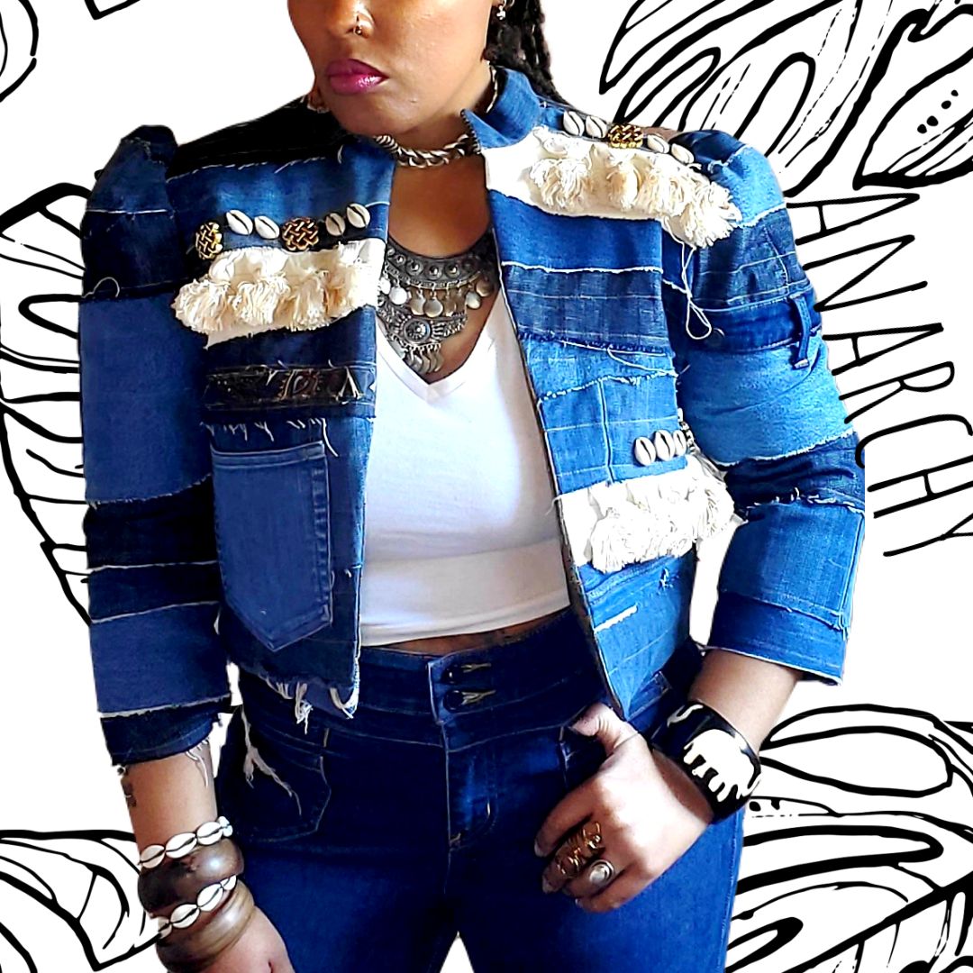 Distressed denim, puffed sleeves, tassels, and beading. This statement piece adds edge to a classic cut jacket. Whether you dress it up or down, this piece is sure to be a show stopper!